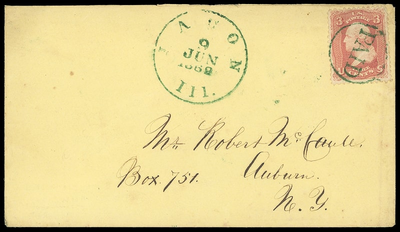 Green "Paid" in Circle, sharp strike ties 3¢ rose (65) , corner flaw, matching "Macon Ill. 9 Jun 1862" cds on yellow cover to Auburn N.Y.; some edge wear, Very Fine and striking green cancel use.