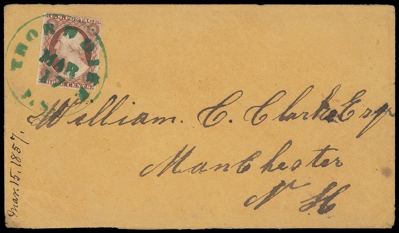 Green "Thorndike Ms. Mar 17" cds, bold strike ties 3¢ dull red (11) , rich color, four full to large margins, on buff cover to Manchester N.H., 1857 docketing at left; bit of flap missing, Very Fine and striking rich green town cds.