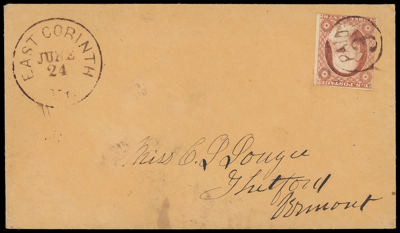 Brown "Paid 3" in Circle, neat strike ties 3¢ dull red (11A) sheet margin single , large margins to touched, matching "East Corinth Vt. June 24" cds on buff cover to Thetford, Vermont, Very Fine and rare brown strike.