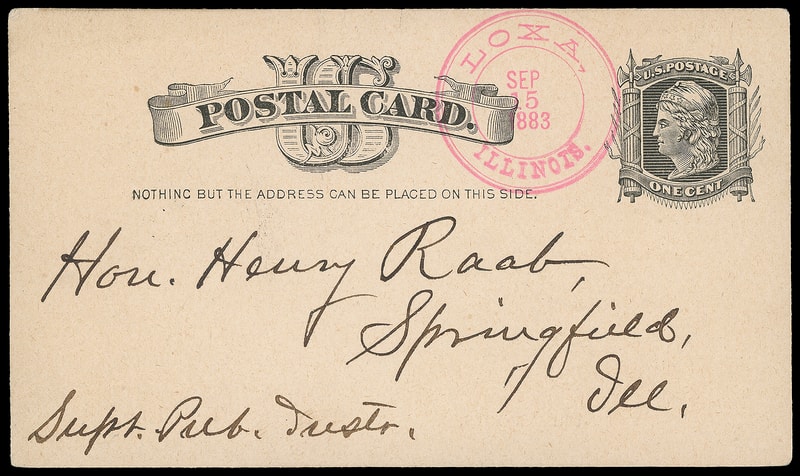 Pink "Loxa, Illinois, Sep 15, 1883", brilliant pink postmark cancels 1¢ postal card (UX7) to Springfield Ill., Extremely Fine and striking true pink.