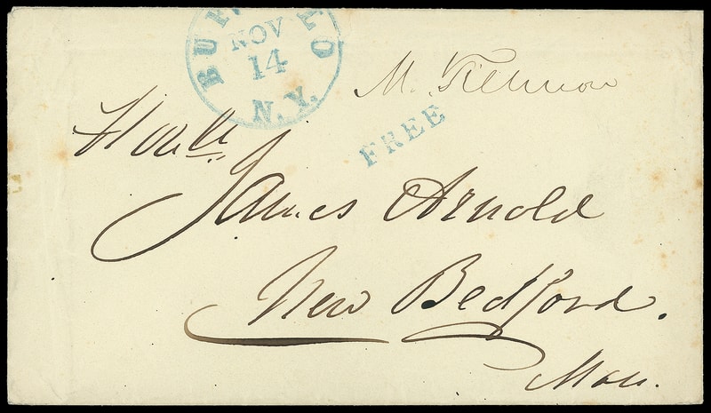 Millard Fillmore, 1800-1874, 13th President 1850-53 , clear manuscript free frank " M. Fillmore " probably as President on cover with partial blue "Buffalo N.Y. Nov 14" cds and matching sharp "Free" rating handstamp to Honble. James Arnold, New Bedford Mass., Very Fine.