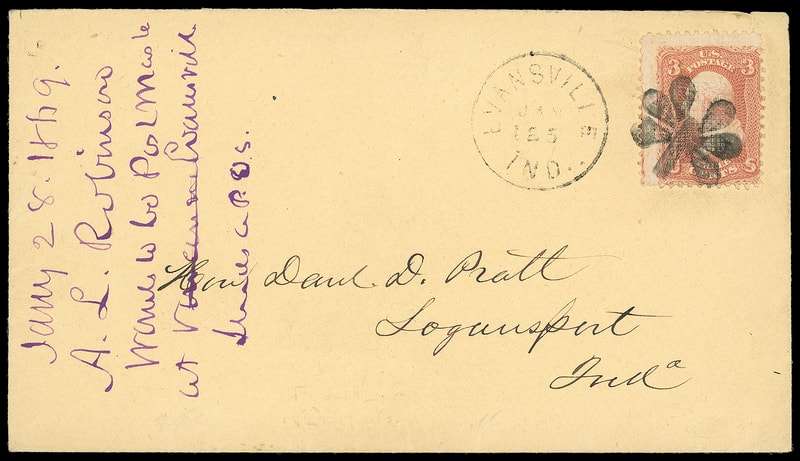 Leaf, perfect bold strike duplexed with "Evansville Ind. Jan 25" cds ties 3¢ red, grilled (94) on buff cover to Logansport Ind., purple 1869 docketing at left, an Extremely Fine strike.