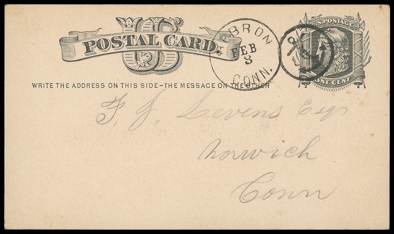 Fouled Anchor in Circle, perfect sharp strike and matching "Hebron Conn. Feb 3" cds cancel 1¢ postal card (UX5) to Norwich Conn., 1879 message, Extremely Fine strike.