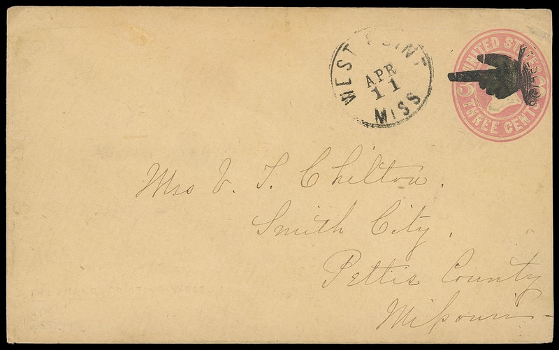Hand Pointing West, remarkable bold strike cancels 3¢ pink (U59) buff entire, matching "West Point Miss. Apr 11" cds to Smith City Miss.; reduced at right just clear of indicia, and Extremely Fine and choice strike.