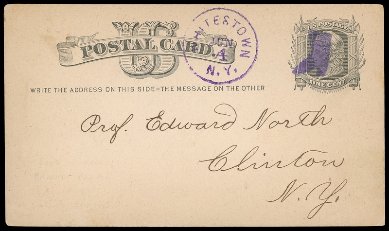 Boot, perfect strike in purple duplexed with "Whitestown N.Y. Jun 4" cds on 1¢ postal card (UX5) to Clinton N.Y., Extremely Fine and rare fancy cancel, ex-Mandel .