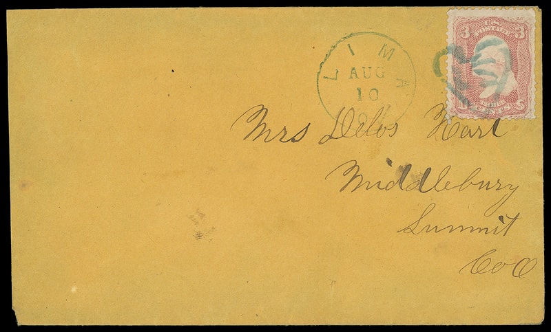"LS" in Hollow Heart, blue fancy cancel duplexed with "Lima O. Aug 10" cds ties 3¢ rose (65) , bright color, on orange buff cover to Middlebury Oh.; slightly reduced at left, stamp with small tear at bottom, Very Fine strike, Very Fine strike, ex-Saadi ; with 1995 P.F. certificate.