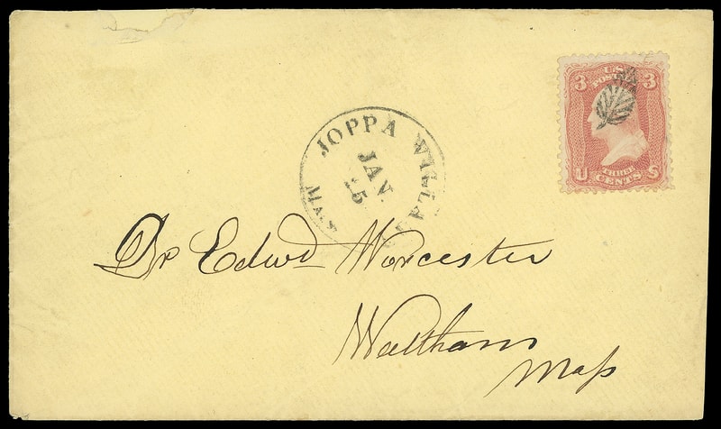 Leaf, perfect fancy cancel strike cancels 3¢ rose (65) , matching "Joppa Village Mass. Jan 25" cds on amber cover to Waltham Mass.; small top left edge mend, partial flap and reduced slightly at right, an Extremely Fine strike.