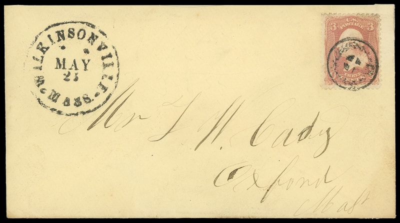 Coin-Style Cancel of Wilkinsonville, Mass., choice strike ties 3¢ rose (65) , matching "Wilkinsonville, Mass., May 23" cds on fresh amber cover to Oxford, Mass., Extremely Fine and quite rare; with 2020 P.F. certificate.