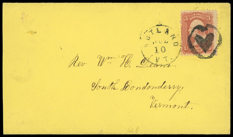 Heart within Heart, bold strike duplexed with "Rutland Vt. Jul 10" cds ties 3¢ red, F. grill (94) on yellow cover to South Londonderry Vt.; reduced slightly at left, Very Fine and choice fancy cancel; with 2016 P.F. certificate.