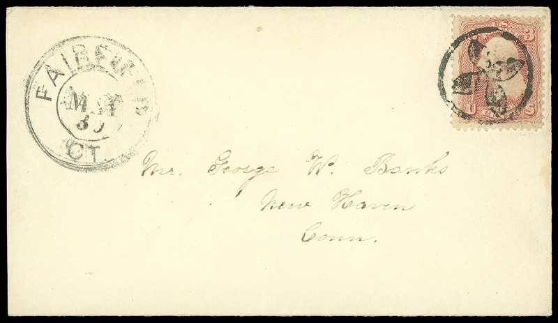 Four-Petal Flower in Circle, superb strike ties 3¢ rose (65) , matching partial "Fairfield Ct. May 30" double-circle datestamp on fresh cover to New Haven Conn.; barely reduced at left, an Extremely Fine gem.