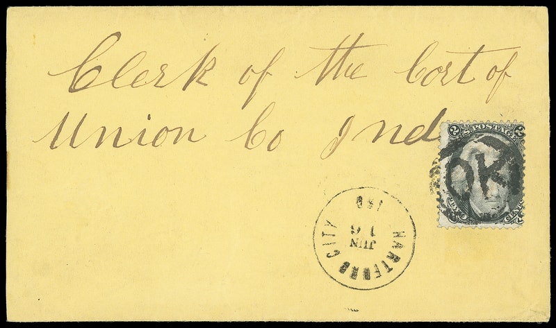 "OK" in Circular Frame of Hartford City Ind., bold strike ties 2¢ black (73) , matching sharp "Hartford City Ind. Jun 16" cds on yellow cover to Clerk of Union Co., Indiana; reduced slightly at left, Very Fine and choice strike.