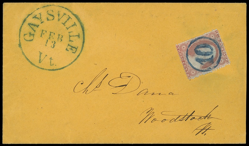 Blue Numeral "10" in Circle, intense strike cancels 3¢ dull red (26), matching balloon Gaysville Vt. Feb 13" cds on orange cover to Woodstock Vt., an Extremely Fine gem.