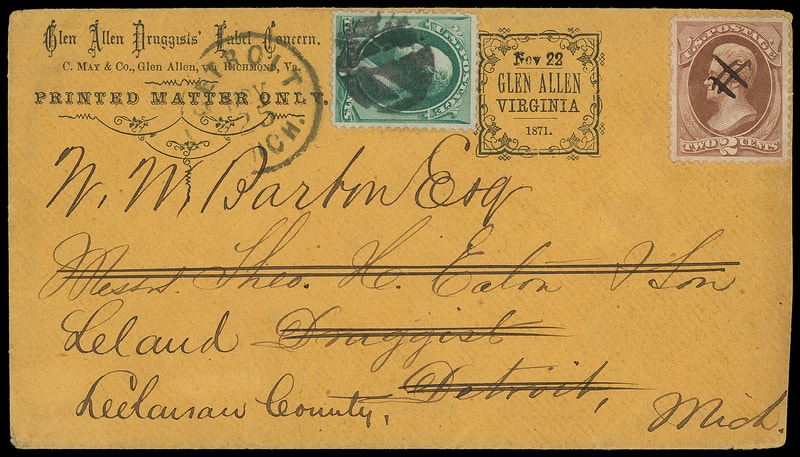 Glen Allen, Virginia, "Nov 22" 1871., preprinted fancy postmark with "Nov 22" handstamp dating on orange buff "Glen Allen Druggists' Label Concern, Printed Matter Only" corner card cover bearing 2¢ red brown (146) , well centered within large margins, neatly canceled by ms. cross-hatch, to Detroit Mich. at the 2¢ printed matter rate, forwarded with 3¢ green (147) tied by cork cancel duplexed with "Detroit Mich. Nov 25" cds to Leland Mich. at 3¢ letter rate, Very Fine and remarkable use.