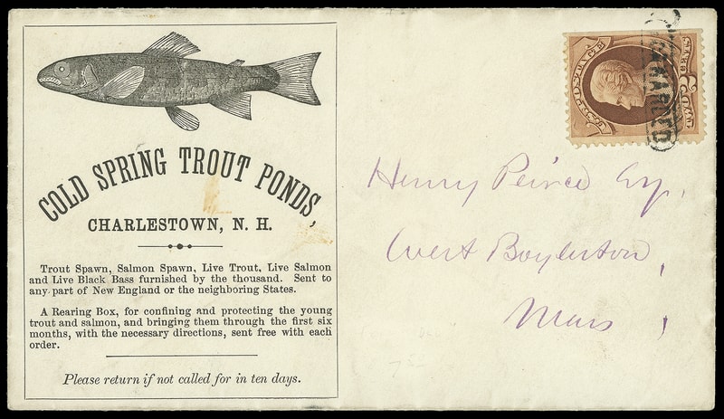 "Forwarded", oval handstamp ties 2¢ red brown (146) , nat. s.e. on illustrated Cold Spring Trout Ponds, Charleston N.H. advertising cover to West Boyleston Mass. at the 2¢ circular rate, flap unsealed, Very Fine.