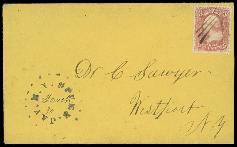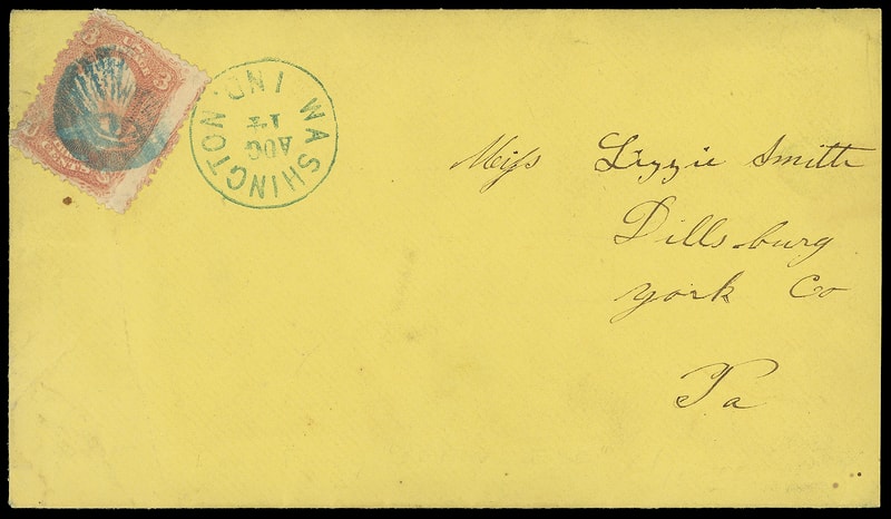 Virtually all known examples of this cancel eminate from this correspondence addressed to Lizzie Smith, Dillsburg, York Co., Pa. Strikes of this cancel with flaws in the Erivan sales realized $5,900 (Sale 7) and $6,490 in (Sale 8).Lot 1139