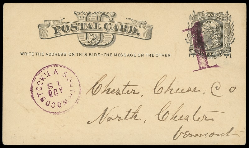 Large "1", bold purple strike cancels 1¢ postal card (UX5), matching "South Woodstock Vt. Aug 18" cds to North Chester Vt., Extremely Fine and choice strike, this spectacular South Woodstock Vt. "1" cancel is far scarcer than the corresponding "3" cancel .