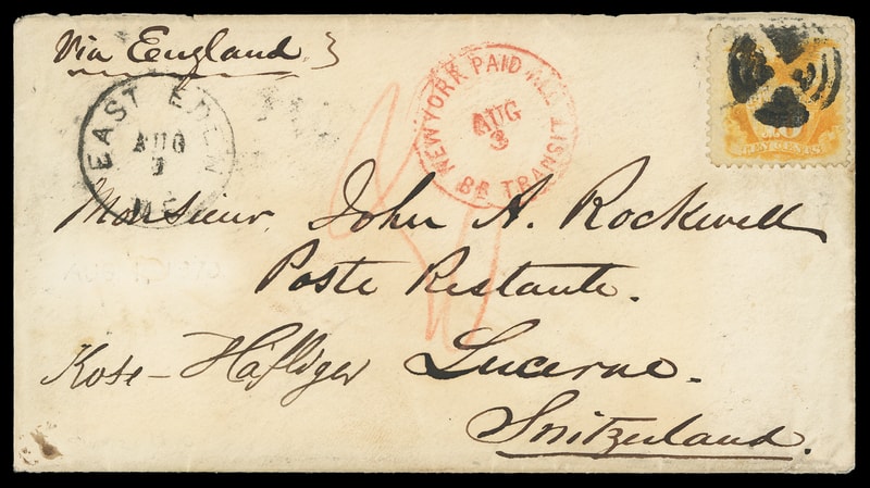 1869, 10¢ yellow, radiant color, tied by quartered cork, matching "East Eden Me. Aug 1" cds on 1870 cover to Lucerne, Switzerland , endorsed "Via England" at top left, red "New York, Paid All, Br. Transit, Aug 3" exchange cds, carried by Cunard Line Cuba departing Aug. 3rd to Queenstown arriving Aug. 12th, sent via France to Basel where "30" centimes emergency surcharge assessed, Zurich (8.19.1870) backstamp; part of flap missing, Very Fine.