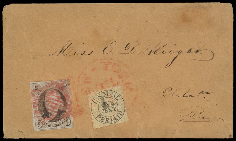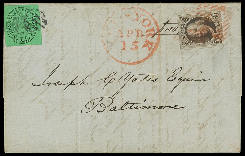 ONE OF THE FINEST 5¢ 1847 ISSUE HANDSTAMP TIED COMBINATIONS WITH A NEW YORK U.S. MAIL CARRIER STAMP.
