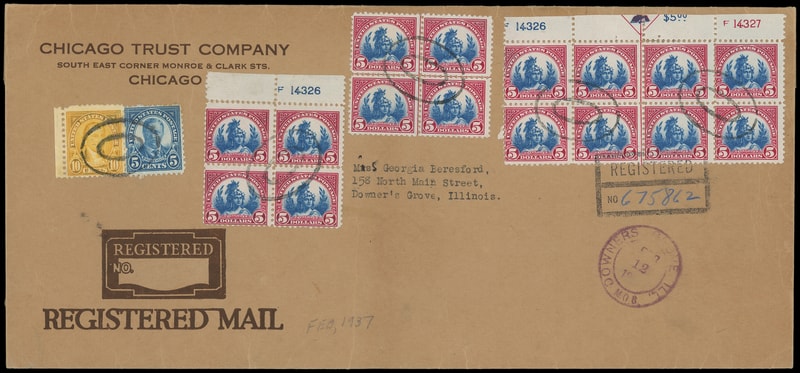 1923, $5 America, Top arrow and double plate numbers F14326/F14327 block of eight, also center line block of four and block of four with blue plate no. F14326, canceled by blind ovals on oversize registered cover to Downers Grove Ill., also used with 5¢ and 10¢ stamps, purple "Chicago Ill. Registered Feb. 11, 1937" backstamp, couple of perf separations, Very Fine.
