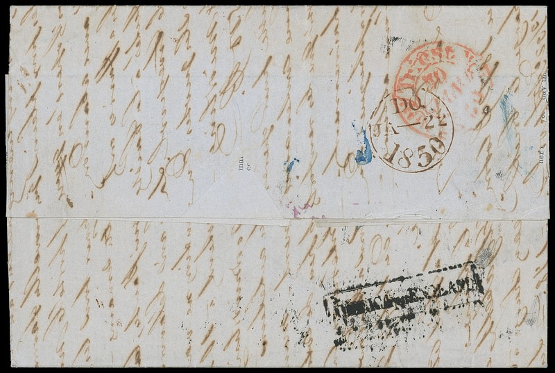 1847, 5¢ red brown, four margins, just tied by partial blue circular grid cancel, matching "Mobile Ala. Dec " cds on gray Dec. 15, 1849 New Orleans printed prices current with written letter to Trieste, Austria , endorsed "via Ostend" at top and "via New York, p. steamer 26 Decb." at bottom, actually carried on Cunard Line Cambria from Boston Jan. 9th to Liverpool arriving Jan. 22nd, London (1.22) transit backstamp and magenta "1/4" 1s4d debit rating, reverse with blurry Aachen black " America per England " (VDL 112) framed handstamp and blue ms. " 26/20 " debit rating, red Trieste (1.30) arrival backstamp and with magenta " 12 " above existing rating totalled to " 58 " Austrian kr. due; letter bleed through, Very Fine and rare transatlantic use.