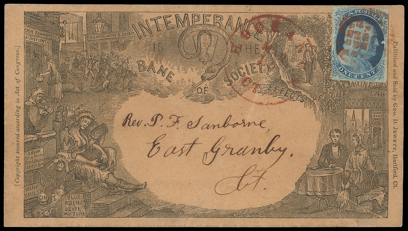 1851, 1¢ blue, type II, Plate 1E, large margins to just touched, canceled by crismon red segmented cork, matching "Hockanum Ct. Mar 10" cds on orange buff cover to East Granby Conn. with " Intemperance is the Bane of Society " propaganda design, outstanding design with numerous scenes including a serpent emerging from a whiskey glass, Geo. D. Jewett Hartford Ct. imprint at right; 1¢ scuff at right not mentioned on accompanying certificate, still Very Fine and striking, particularly desirable with a red cancel, ex-Brooks, Fleckenstein, Rogers, Bailar ; with 2001 P.F. certificate.