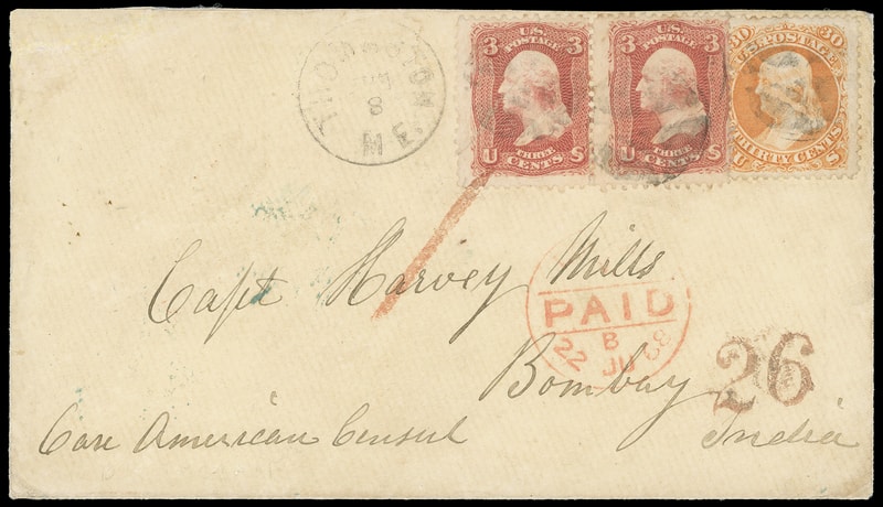 1861, 30¢ orange, used with 3¢ rose (65) pair , each tied by cork cancel duplexed with light "Thomaston Me. Jun 8" cds on 1868 light buff cover to Bombay, India , red New York, Paid All, Br. Transit, Jun 9" exchange cds with matching " 26 " credit handstamp, red London Paid (6.22) transit and red "1" pence colonial credit handstamp; top left corner mend, Very Fine and rare 36¢ British Mail rate via Marseilles.