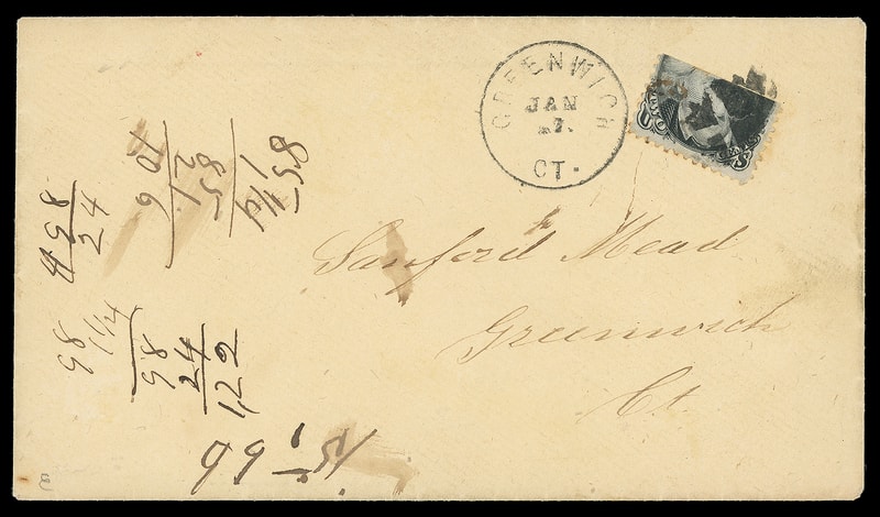 1867, 2¢ black, E. grill, horizontal bisect, bottom half, tied by quartered cork cancel with "Greenwich Ct. Jan 17." cds on unsealed buff drop cover, original Jan. 4th 1869 Greenwich & Rye Steamboat Company annual meeting announcement enclosure dated Jan. 4, 1869, mathematical notations at left, stamp has some additional brown ink at left which matches a couple small smears elsewhere on the cover, Very Fine, ex-Col. McClellan, Faust ; with 1981 P.F. certificate.