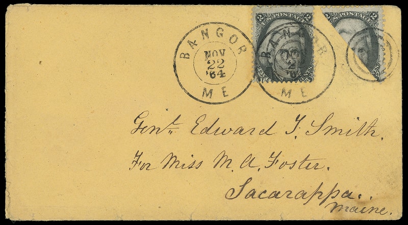 1863, 2¢ black, diagonal bisect, used as 1¢ as part of 3¢ rate, top right half, used with 2¢ black (73) single, tied by two strikes of "Bangor Me. Nov 22 '64" duplex with four-ring cancel on buff cover to Saccarappa, Maine; some edge wear, Very Fine and choice bisect use; with 2015 P.F. certificate.
