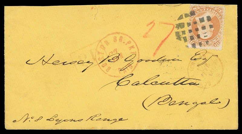 1861, 30¢ orange, fresh color, tied by circular grid cancel, red "Boston Br. Pkt. 'Paid' 27 Jan" exchange cds with red crayon "27" cent credit on orange 1866 cover to Calcutta, India , red French (2.12) transit, reverse with Marseilles (2.14) transit and red Calcutta (3.19) arrival octagon; partial flap and small top edge tear, reduced slightly at top, otherwise Very Fine and scarce use paying the 30¢ French Mail rate.