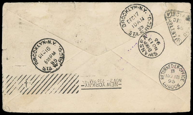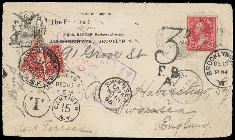Postage Due, 2¢ & 10¢ deep claret, bisects, 2¢ bottom half of horizontal bisect, 10¢ bottom left half of diagonal bisect, tied by "Brooklyn, N.Y., Rec'd, Dec 17, 95" cds on short paid cover to Swansea, England originally bearing 2¢ red (279Bc) tied by "Brooklyn N.Y., Nov 2, 95" duplex, New York "T" "15 Centimes, N.Y." duplex handstamp, Swansea (11.13) arrival backstamp, Swansea (11.15) and "R.L.B., Bristol" (11.16) transits, "Returned Lr. Office, London" (11.18) backstamp, large "3d, F.B. A." handstamp for 6¢ due, large purple hand "Dead Letter Office, Washington D.C., Returned To Writer, Collect '6' Cts" handstamp; small edge tears and wear, contemporary return address abrasion, a Very Fine and exceptional use.