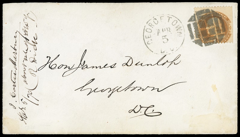 1869, 1¢ buff, natural s.e. at right, tied by full strike of fancy Geometric cancel duplexed with "Georgetown, D.C. Apr 5" cds on local drop cover; cover missing backflap, an Extremely Fine strike of this rare fancy cancel; with 2012 P.F. certificate.