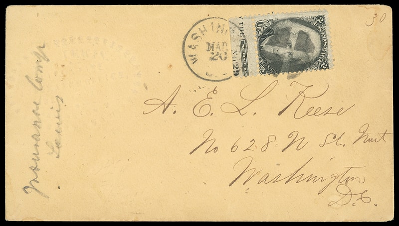1863, 2¢ black, with bottom part imprint and plate no. 29 selvage , centered to bottom right, tied by "Washington D.C. Mar 20" cds and quartered cork duplex on albino embossed corner card cover to local street address, Very Fine and scarce plate number example on cover, ex-Mackey, Metzger, Faust, Flannery .