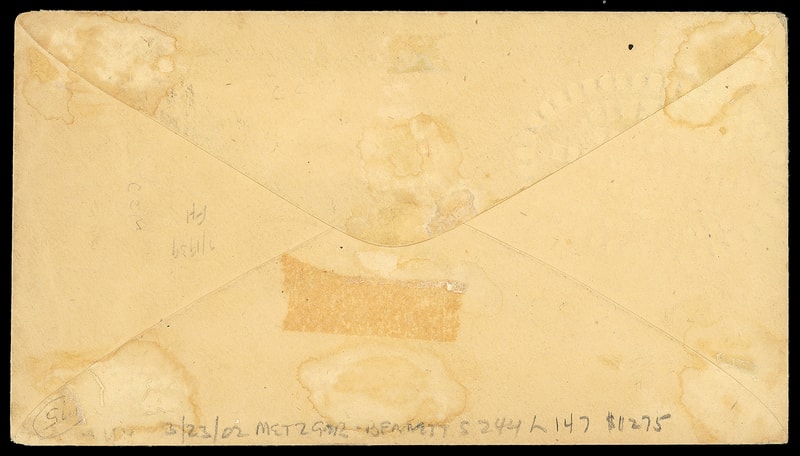 There is one other example of this oversized Cussons, May & Sheppard mailing to the same addressee Mr. C.M. Russell in Wilmington, Vt. bearing 1¢ blue #156 single and 2¢ vermilion #178 pair.Lot 1189