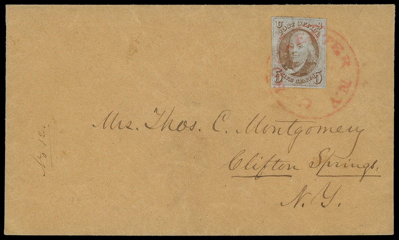 1847, 5¢ red brown, large margins, bright color, worn-plate impression, tied by red "Rochester N.Y. '5' Dec 20" integral-rate cds on buff cover from the Montgomery correspondence to Clifton Springs N.Y., correspondence "No. 12" docket, Very Fine.