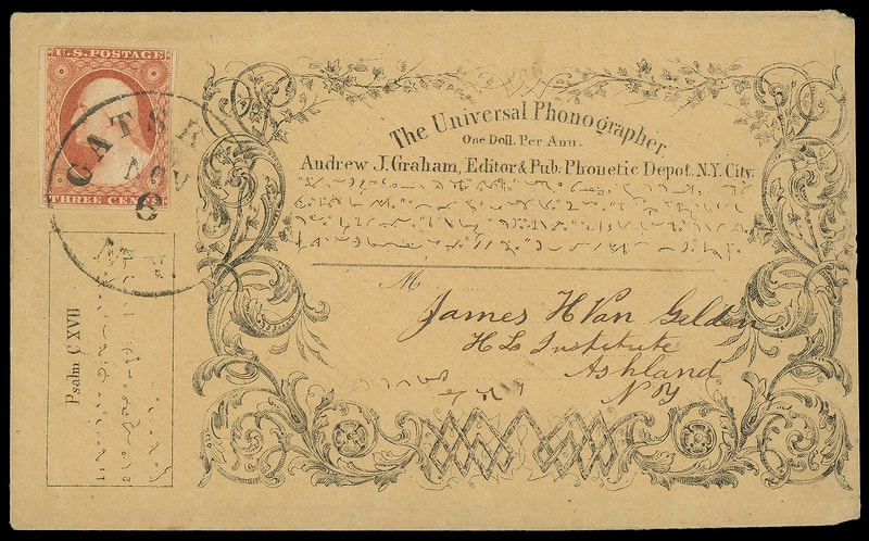 1852, 3¢ dull red, type I, tiny tear at right, tied by "Catskill, N.Y." cds on printed Universal Phonographer overall advertising buff cover to Ashland N.Y.; reduced slightly at right, Very Fine.