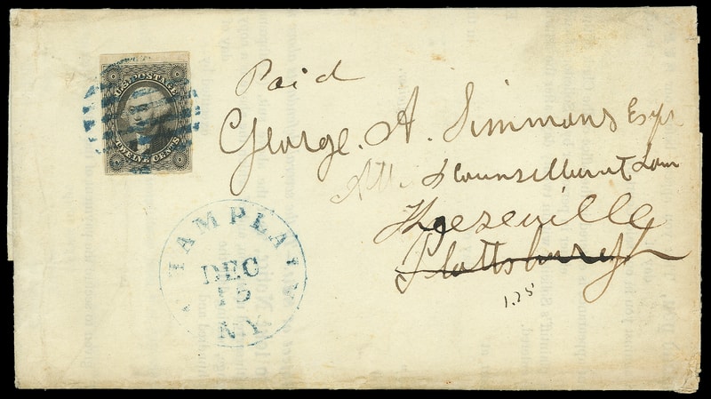 1851, 12¢ gray black, top sheet margin single, clear to large margins, tied by large blue open grid, matching "Champlain N.Y. Dec 15" cds on folded printed court notice to Keeseville, New York; some edge wear, Very Fine; with 2016 P.F. certificate.