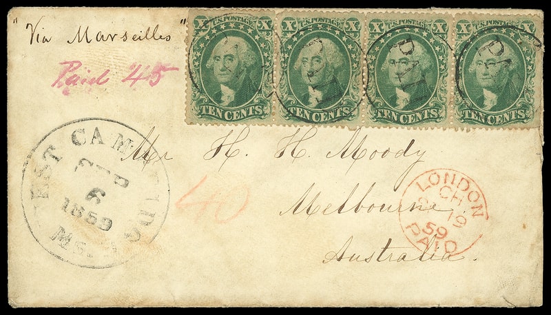 1857, 10¢ green, type III, strip of four , used with 1¢ blue (24) horizontal pair and 3¢ dull red (26) on reverse, each canceled by "Paid" in circle, matching "West Cambridge, Ms., Sep 6, 1859" on cover to Melbourne, Australia , additional magenta "Paid 45" rating and endorsed "Via Marseilles" at top left, bold "Boston, Br. Pkt. Sep 7" exchange cds backstamp and red crayon "40" cent credit to G.B., red London Paid (9.19) transit cds, red Melbourne (11.14) arrival backstamp; few tiny stamp flaws, some edge wear and light soiling, F.-V.F. and scarce franking for the 45¢ rate to Australia.