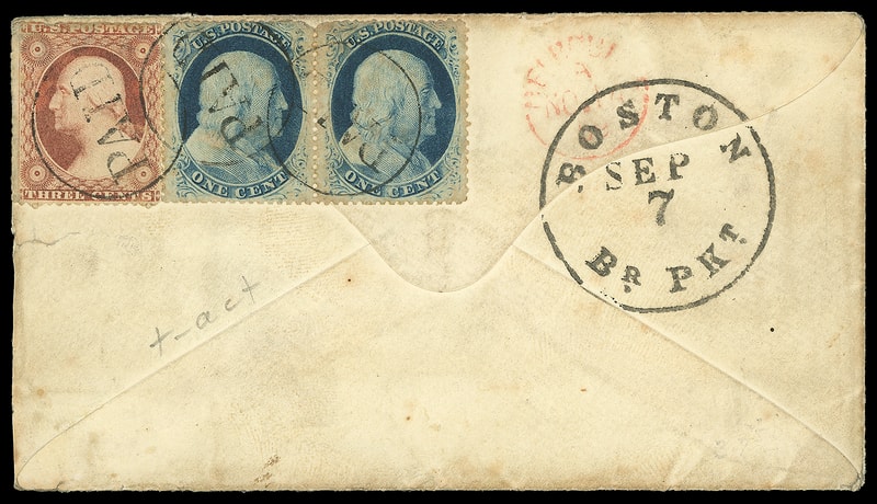Some covers from Philadelphia to Boston have a single 5¢ 1847 stamp for the under-300 miles rate, while others have a 5¢ pair or single 10¢ 1847 for the over-300 miles rate (the straight-line distance is 267 miles).Lot 1148