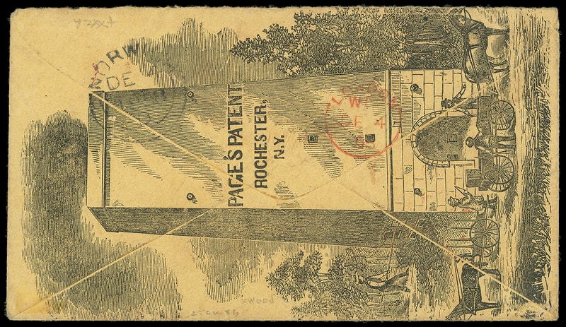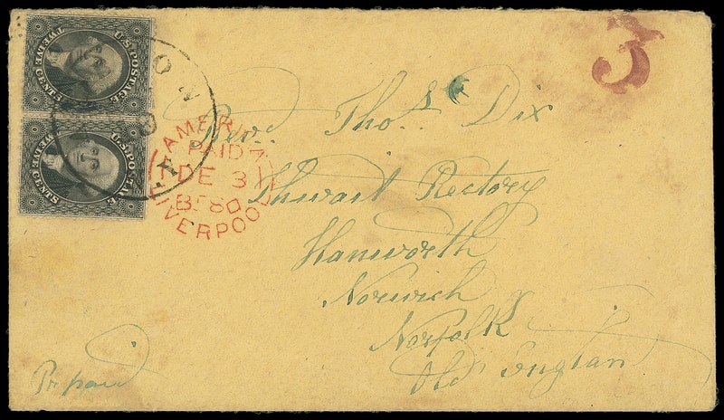 1857, 12¢ black, plate I, horizontal pair , tied by "Albion, N.Y. Nov 10" cds on 1858 buff cover to Norwich, England , New York red "3" credit h.s. to G.B., red "American, Liverpool, Paid, De 3" entry cds, reverse with red London (12.4) transit and Norwich (12.4) double-arc arrival as well as overall "Page's Patent, Rochester, N.Y." illustrated ad showing horse and carriages on front of large smokestack furnace ; slight cover soiling, Very Fine and attractive use; with 2023 P.F. certificate.