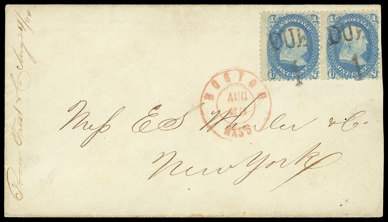 1861, 1¢ blue, horizontal pair , tied by two strikes of " Due 1 " handstamp, red "Boston Mass. Aug. 25" double-circle datestamp on 1864 cover with embossed Boon, Frost & Co. Commission Merchants backflap to New York N.Y.; slightly reduced at right, right stamp with faint pre-use vertical crease at right not mentioned on accompanying certificate, Very Fine and most unusual, Very Fine and most unusual, apparently short paid 1¢ and charged double the deficiency; with 2004 P.F. certificate.