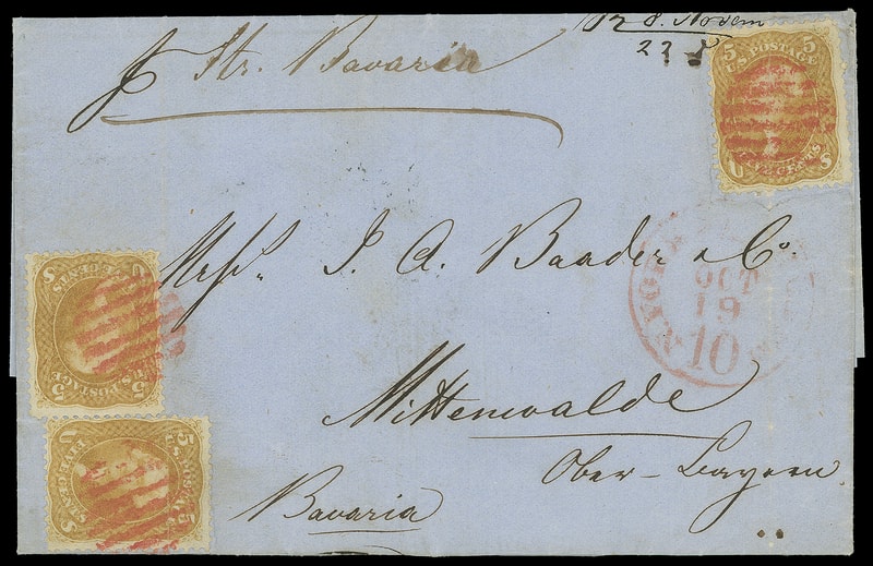1861, 5¢ brown yellow, three singles, each tied by NYFM circular grid cancel, matching "New York 'Paid 10' Hamb. Pkt. Oct 19" credit exchange cds on 1861 blue folded cover to Mittenwalde, Germany, endorsed "p. Str. Bavaria" at top, reverse with Hamburg (11.4.61) transits; some ms. notes tie stamp upper right, file folds affect two stamps, Very Fine appearance.