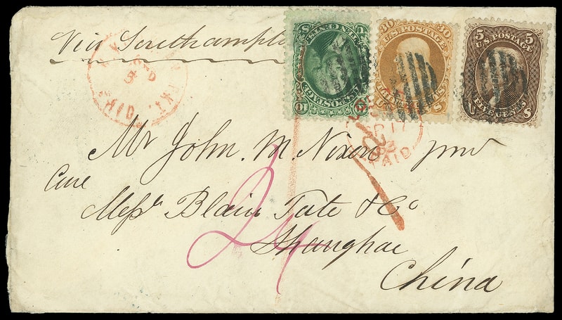1861, 30¢ orange, used with 5¢ brown (76) and 10¢ green (68) , tied NYFM open circular grid cancels, partial red "N. York, Am. Pkt. Paid, Sep 5" exchange cds and magenta "24" credit rating, endorsed "Via Southampton" at top, red London Paid (9.17) transit cds and red "1d" Colonial credit handstamp, blue Hong Kong "C" (11.17.63) transit and Shanghae (11.24) arrival cds, red crayon "1" pence rating; opened at left, Very Fine and colorful franking to China.
