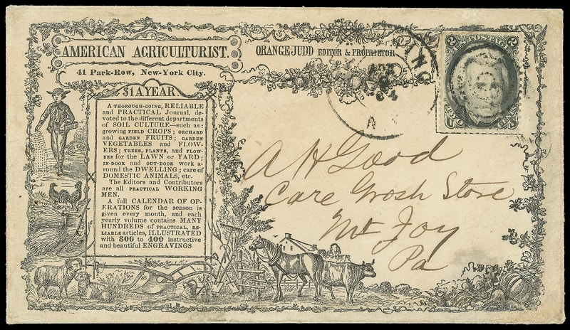 1863, 2¢ black, tied by "Flushing N.Y., Apr. 2, 1864" double-circle datestamp and target duplex on overall American Agriculturist illustrated cover showing livestock and intricate floral border to Mt. Joy Pa., few edge repairs, stamp with fault at top, Very Fine appearance, an attractive advertising cover; with clear 1983 P.F. certificate.