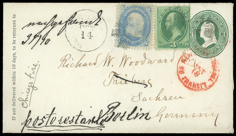 1867, 1¢ blue, F. grill, well centered, used with 3¢ green (147) , small tear, all tied by grid cancels duplexed with "Augusta Me. Oct 14" cds on 3¢ green (U82) entire to Frieberg, Germany, red "New York, Paid All, Br. Transit, Oct 18" exchange cds, Frieberg (10.29) arrival backstamp and forwarded to Berlin, blue (11.1) arrival backstamp, endorsed "Chicago Fire" at left perhaps indicating news of the devastating great fire of Oct. 8-10, 1871, Very Fine and attractive combination franking for the 7¢ rate.