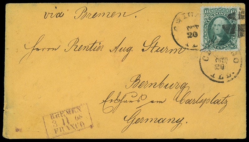 1867, 10¢ yellow green, F. grill, choice centering amid wide margins, tied by "Chicago, Ill., Oct 20" cds strikes and quartered cork duplex on orange cover to Bernburg, Germany , purple "Bremen, Franco, 3 11 68" framed transit, German (11.4) arrival backstamp, and transit backstamp, Very Fine and choice, Very Fine and choice with a gem stamp, ex-Karlen ; signed Brookman, with 1986 P.F. certificate.