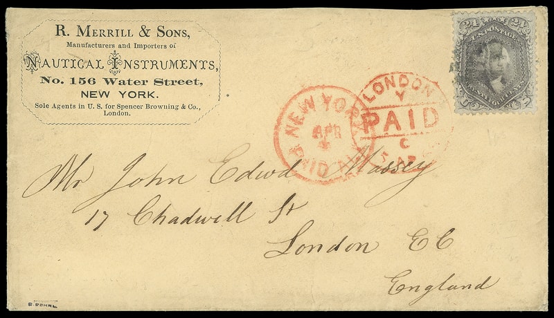 1867, 24¢ gray lilac, F. grill, well centered within balanced margins, tiny perf hole tear, tied by grid cancel, red "New York, Paid All, Apr 4" exchange cds on 1868 R. Merrill & Sons Nautical Instruments fancy corner light buff cover to London, England , red London Paid (4.15.68) arrival cds; bit of flap missing, Very Fine and scarce 24¢ F grill use; with clear 2022 P.S.A.G. certificate.