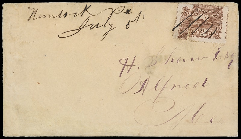 1869, 2¢ brown, bisected, right half in combination with 2¢ brown (113) single, both tied by manuscript cancels, matching "Numlock Pa., July 5th" postmark on light buff cover from the H.B. Shaw correspondence to Alfred, Me.; cover with some ms. notations lightened and minor edge strengthening, Very Fine appearance; with 2014 P.F. certificate.