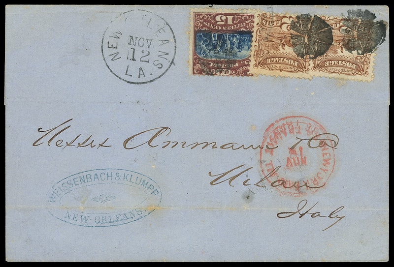 1869, 15¢ brown & blue, type II, used with two 2¢ brown (113) singles, each tied by small circular cork cancel duplexed with "New Orleans La. Nov 12" cds on blue 1869 folded letter to Milan, Italy , blue "Weissenbach & Klumpp, New Orleans" merchant double-oval, red "New York, Paid All, Br. Transit, Oct Nov 18" exchange cds, Milano (12.1.69) arrival backstamps; light file fold toning, Very Fine and attractive 1869 issue use to Italy; with 2017 P.F. certificate.