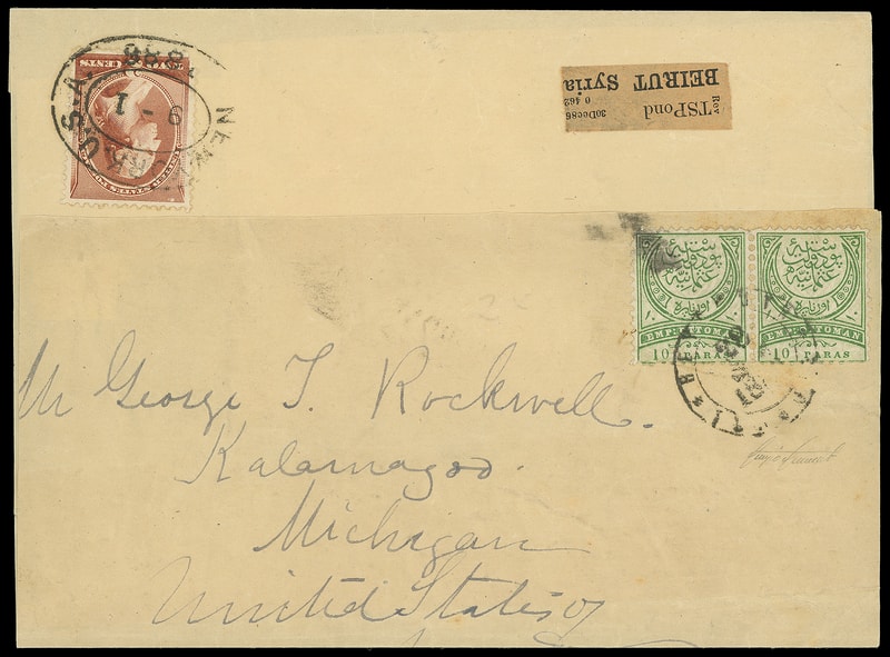 1883, 2¢ red brown, tied by "New York, U.S.A. 9-1, 1886" double-oval foreign mail datestamp on wrapper to Beirut, Syria , wrapper turned and addressed to Kalamazoo, Mich. bearing Turkey 1886, 10ps green on pale green, horizontal pair tied by Beyrouth cds, Very Fine; with 2007 P.F. certificate.