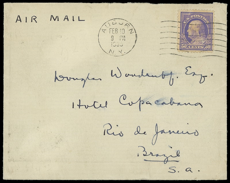 1914, 50¢ violet, S.L. watermark, perf. 12, beautiful centering and bright fresh color, tied by "Auburn N.Y. Feb 10, 1935" machine cancel on European size cover to Rio de Janeiro, Brazil , Feb. 19th arrival backstamp, Very Fine, late but appropriate use of this scarce 50¢ Franklin, ex-Siskin, Dr. Martin .